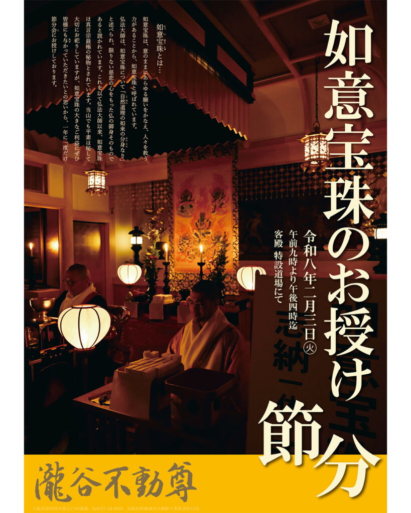 弘法大師は、如意宝珠について「自然道理の如来の分身なり」と述べられ、限りない慈悲の心をもった仏の御身そのものであると説かれています。これを以て弘法大師以来、如意宝珠は真言宗最極の秘物とされています。当山でも平素は秘して大切にお祀りしていますが、如意宝珠の大きなご利益にぜひ皆様にも与かっていただきたいとの思いから、一年に一度だけ節分会にお授けしております。